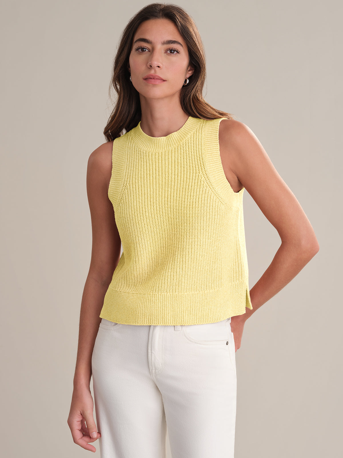 A woman with long brown hair models a sleeveless, light yellow crew neck knit top by 525 America and high-waisted white pants against a plain beige background, showcasing a versatile look with a neutral expression.