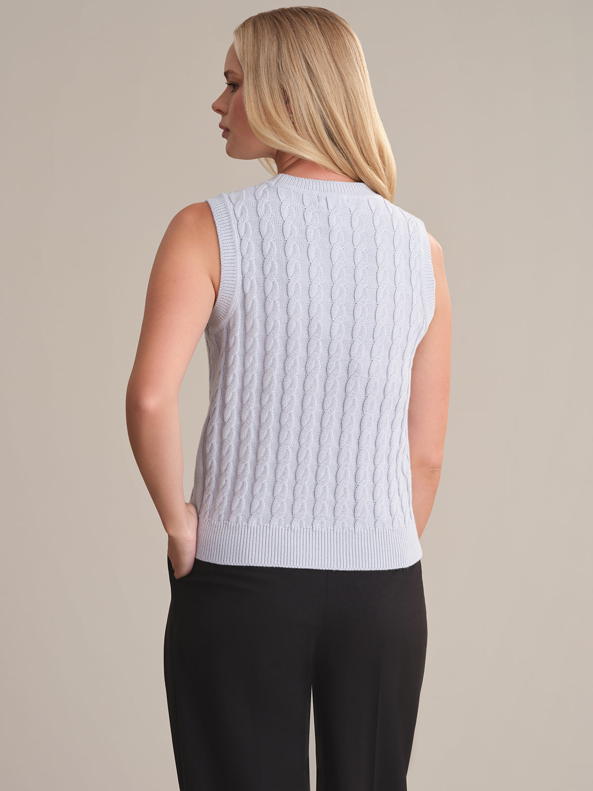 The perfect cozy layer with a classic cable knit, crewneck and ribbing around the neckline, armholes and hem. The Ivy: Cable Cotton Tank easy silhouette make it pairable and wearable with just about anything.