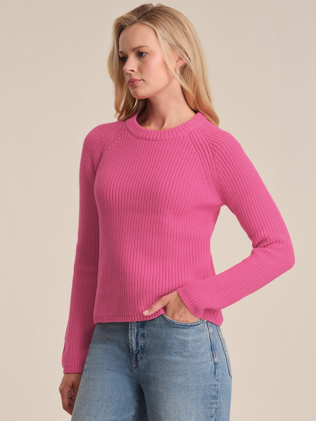 Someone wearing a 525 America bright pink cotton shaker stitch sweater with raglan sleeves and light blue jeans stands against a plain beige background, looking to the side with one hand in their pocket.