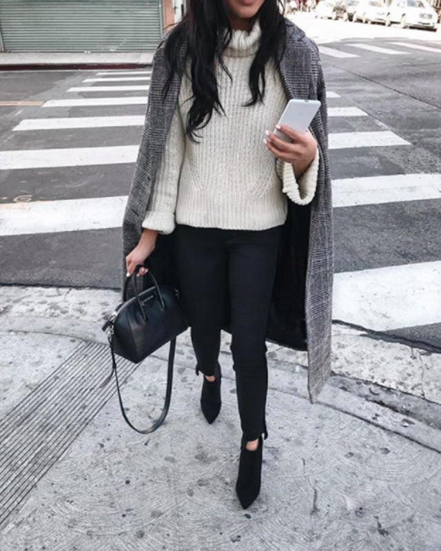 Aimee Santos of lifestyle blog, Swell Mayde, is a one-woman show, staying warm and on-the-go in 525 America's Merino Wool Tulip Sleeve Turtleneck Sweater.