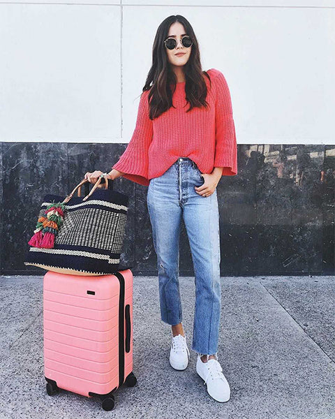 Paola Alberdi of lifestyle blog Blank Itinerary lands effortless traveling style in 525 America's Crop Off The Shoulder Shaker With Tulip Sleeves.