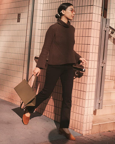 Stephanie Liu makes monochromatic modern in a sleek all-neutral look featuring 525 America's Cotton Shaker Knit Turtleneck Sweater.