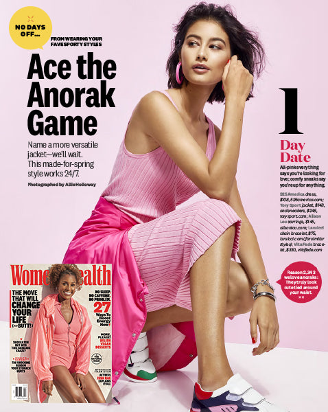 Women's Health Magazines shows how easy it is to layer 525's Wide Rib Knit Snap Tank Dress in our Signature Stretch. Their suggestion? Add the season's must have anorak to play up the tank dress' sporty style.