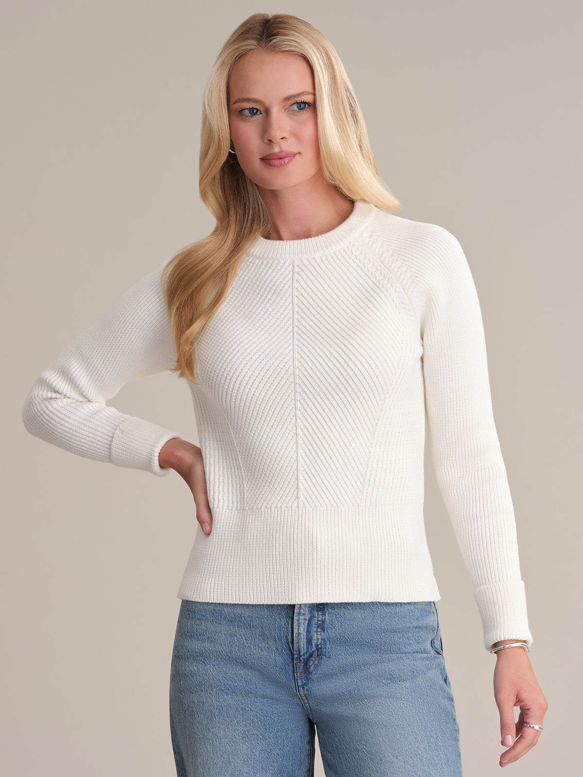 100% Cotton Someone with long blonde hair wears a 525 America white cotton shaker stitch sweater with raglan sleeves and dark pants. With a hand in their pocket, they pose against a neutral background, showcasing the fitted silhouette of their outfit.A person with long blonde hair is shown in profile against a beige background, wearing a fitted white cotton shaker stitch sweater with raglan sleeves by 525 America, paired with dark pants.