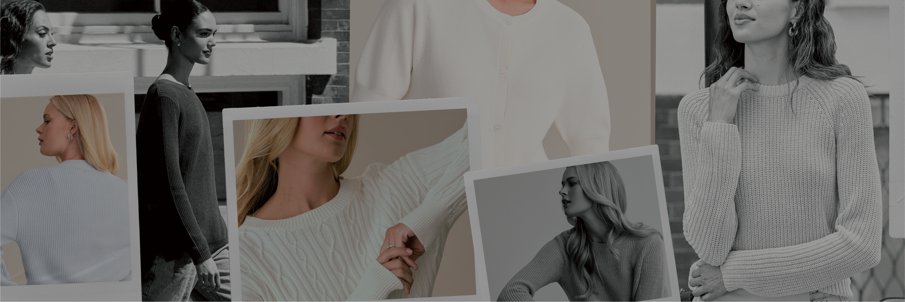 Best Seller A person stands against a plain background wearing a black 525 America cotton shaker stitch sweater and white pants with a black belt, looking to the side and adjusting their hair with both hands.A woman with long brown hair wears a black ribbed knit raglan sleeve sweater by 525 America and white pants, standing against a plain beige background and gazing slightly to the side with a neutral expression.
