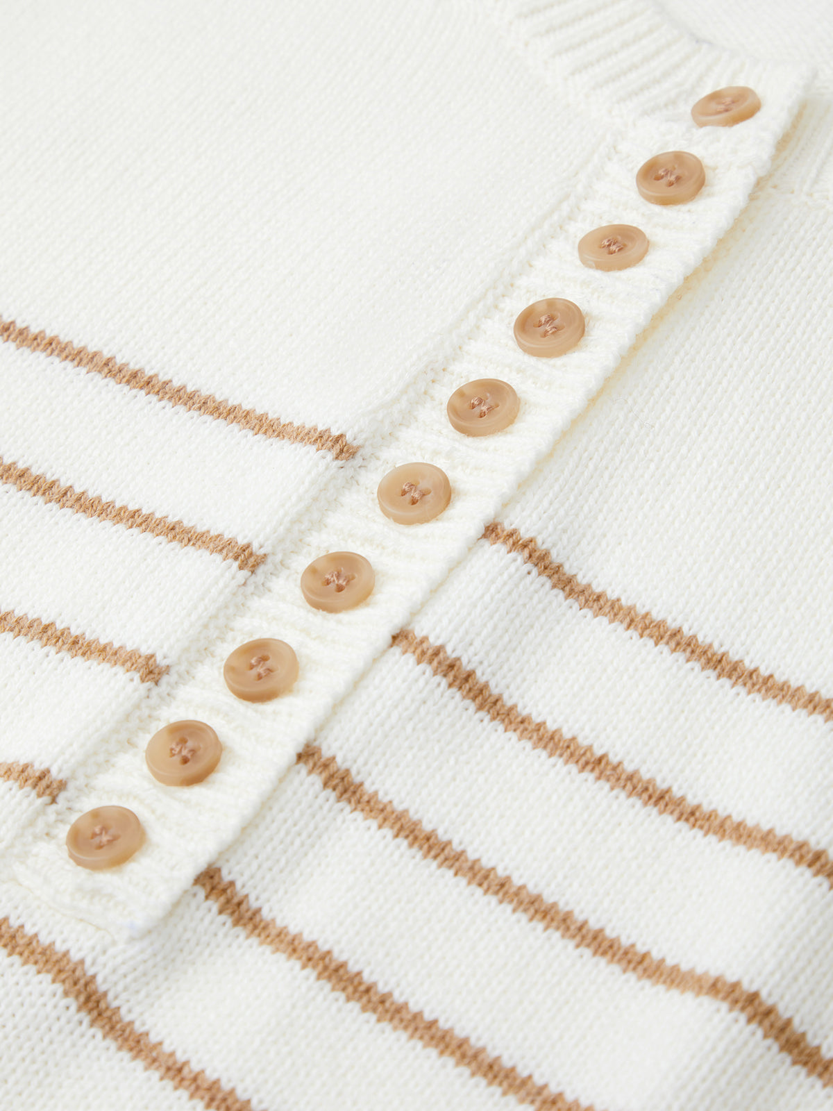 Designed with a stylish half-button placket and contrast stripe pattern, this versatile sweater blends casual ease with refined detail.