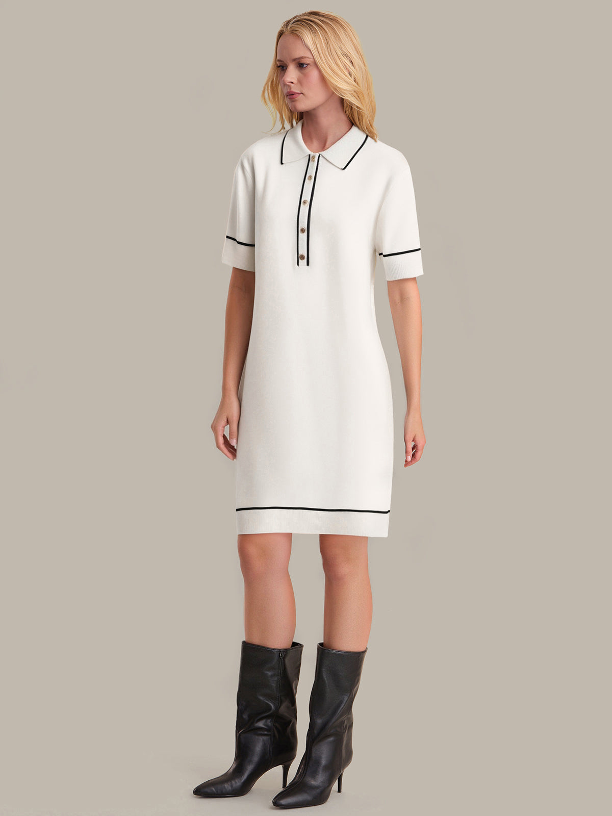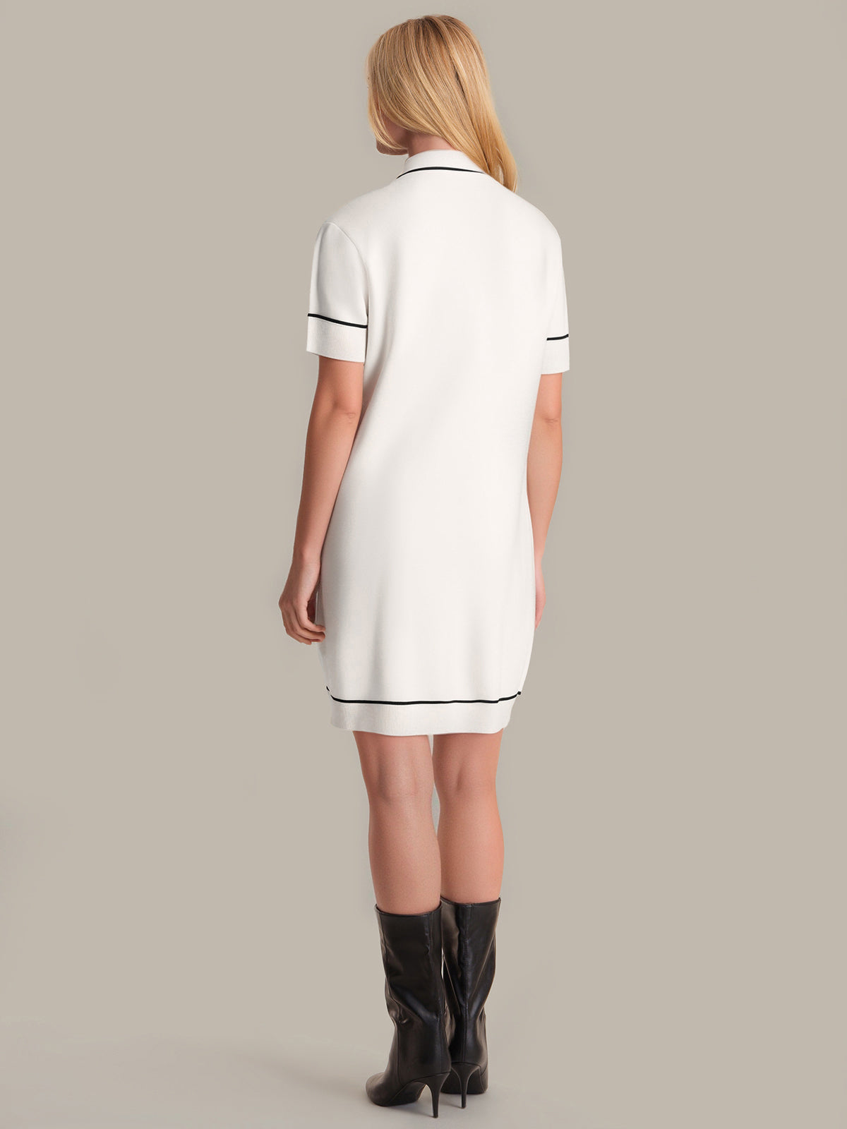 This mini dress is made from our favorite cotton fabric in a classic fit. It has short sleeves, a button front and is finished with a contrast collared neckline. Wear yours with sandals or take it into fall and winter with knee high boots.