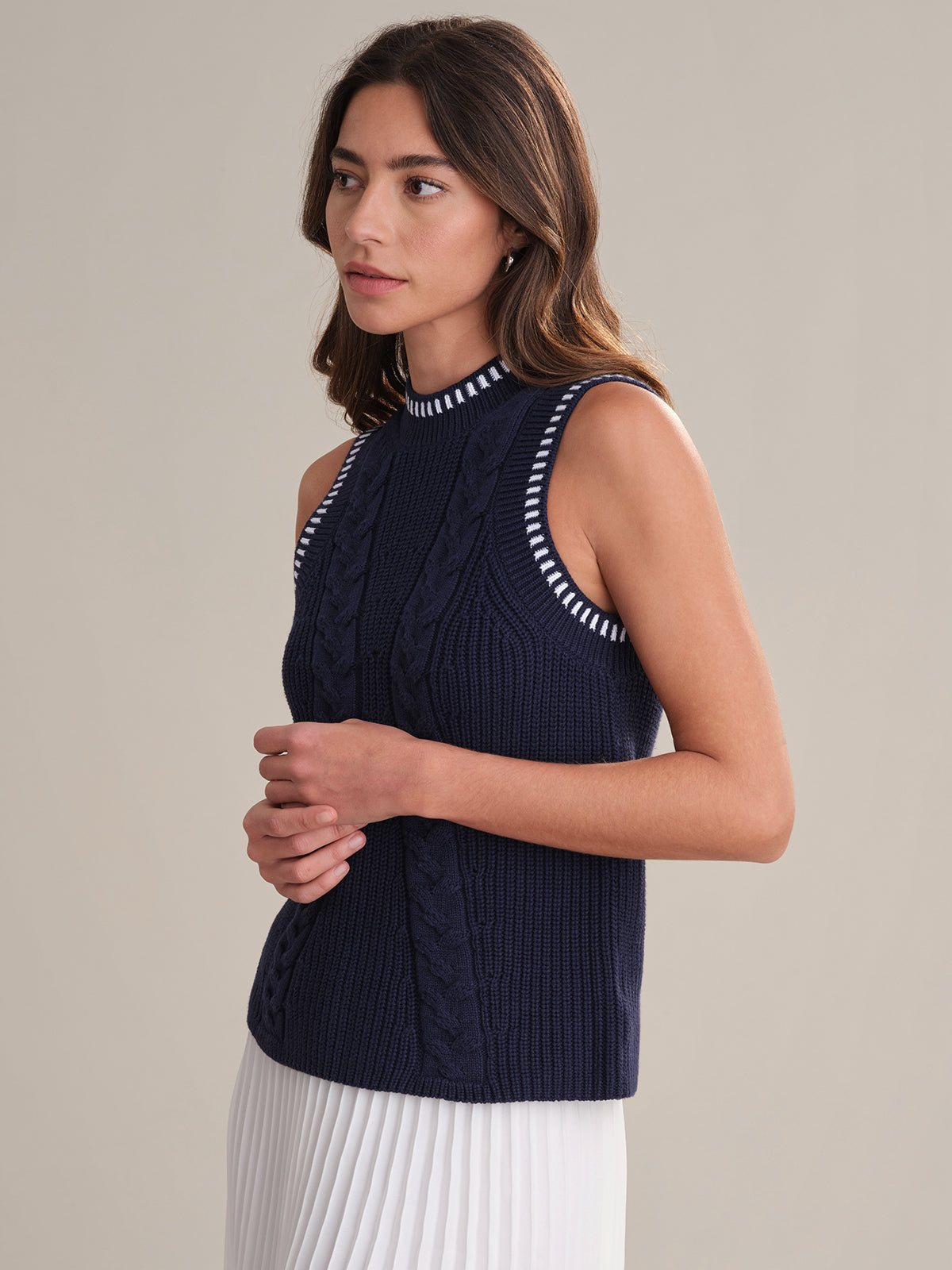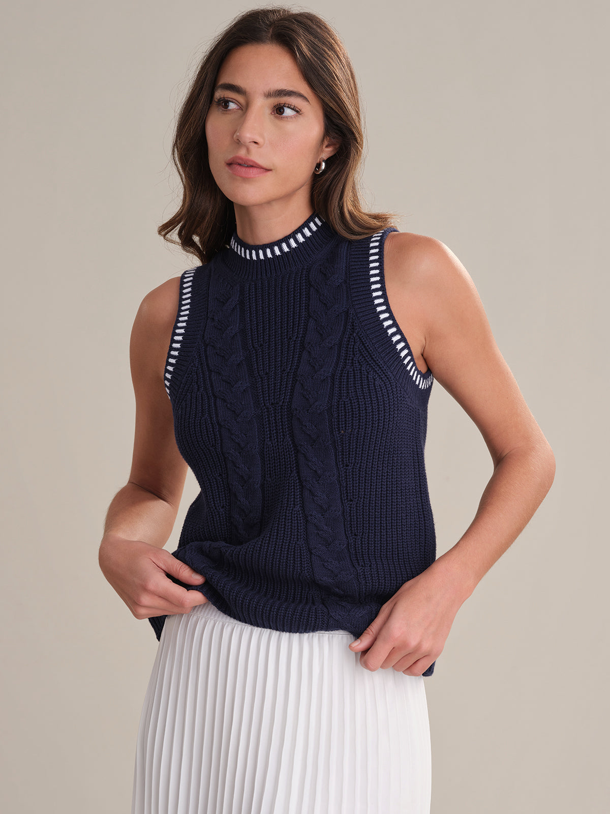 Elevate your wardrobe with a sweater-tank knit in a double cable stitch from breathable cotton and tipped in contrast whipstitch.