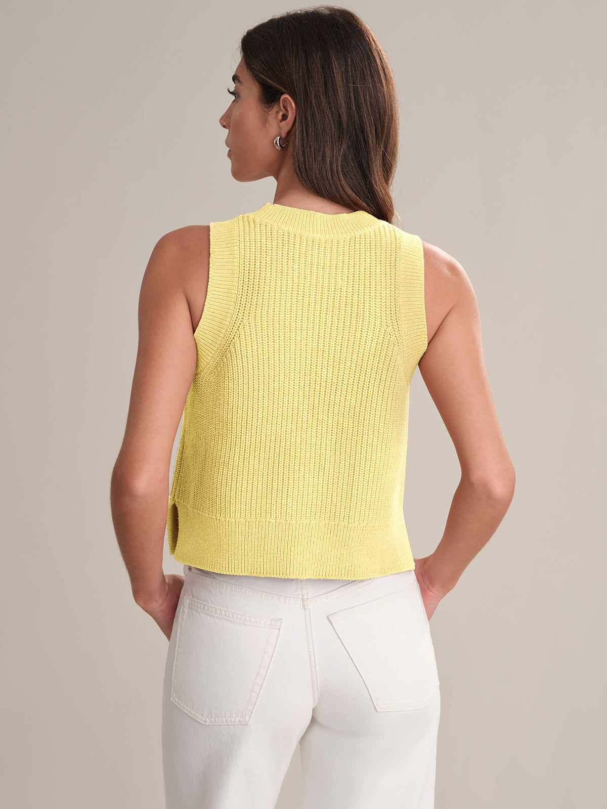 A woman with long brown hair models a sleeveless, light yellow crew neck knit top by 525 America and high-waisted white pants against a plain beige background, showcasing a versatile look with a neutral expression.