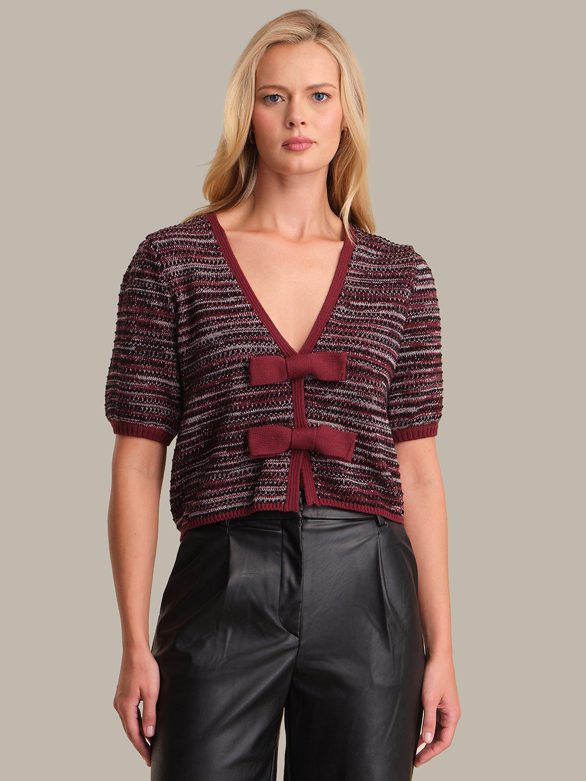 The newest update to our Elaine: the feminine cardigan with a twist. Its V-neck, short puff sleeves, and rib trim add style, while the bow ties on the front give it a touch of femininity. Stay stylish and cozy with this must-have addition to your wardrobe.