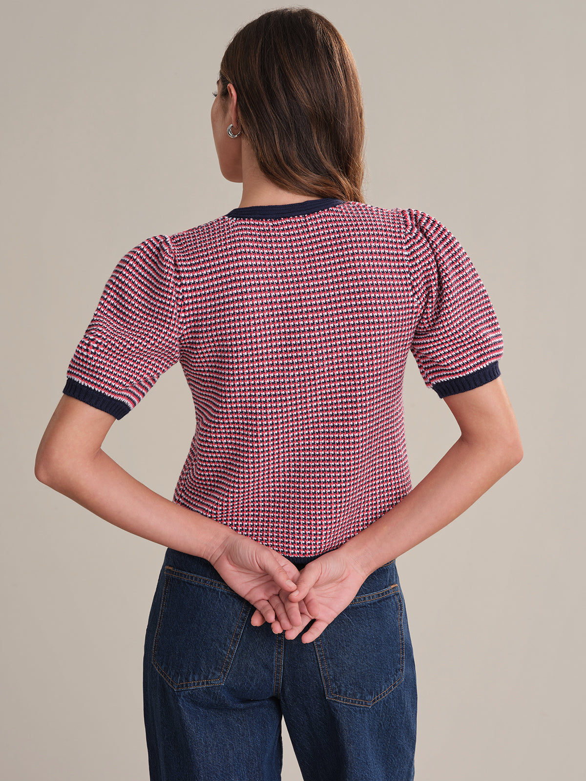 Introducing Elaine: the feminine cardigan with a twist. Its V-neck, short puff sleeves, and rib trim add style, while the bow ties on the front give it a touch of femininity. Stay stylish and cozy with this must-have addition to your wardrobe.