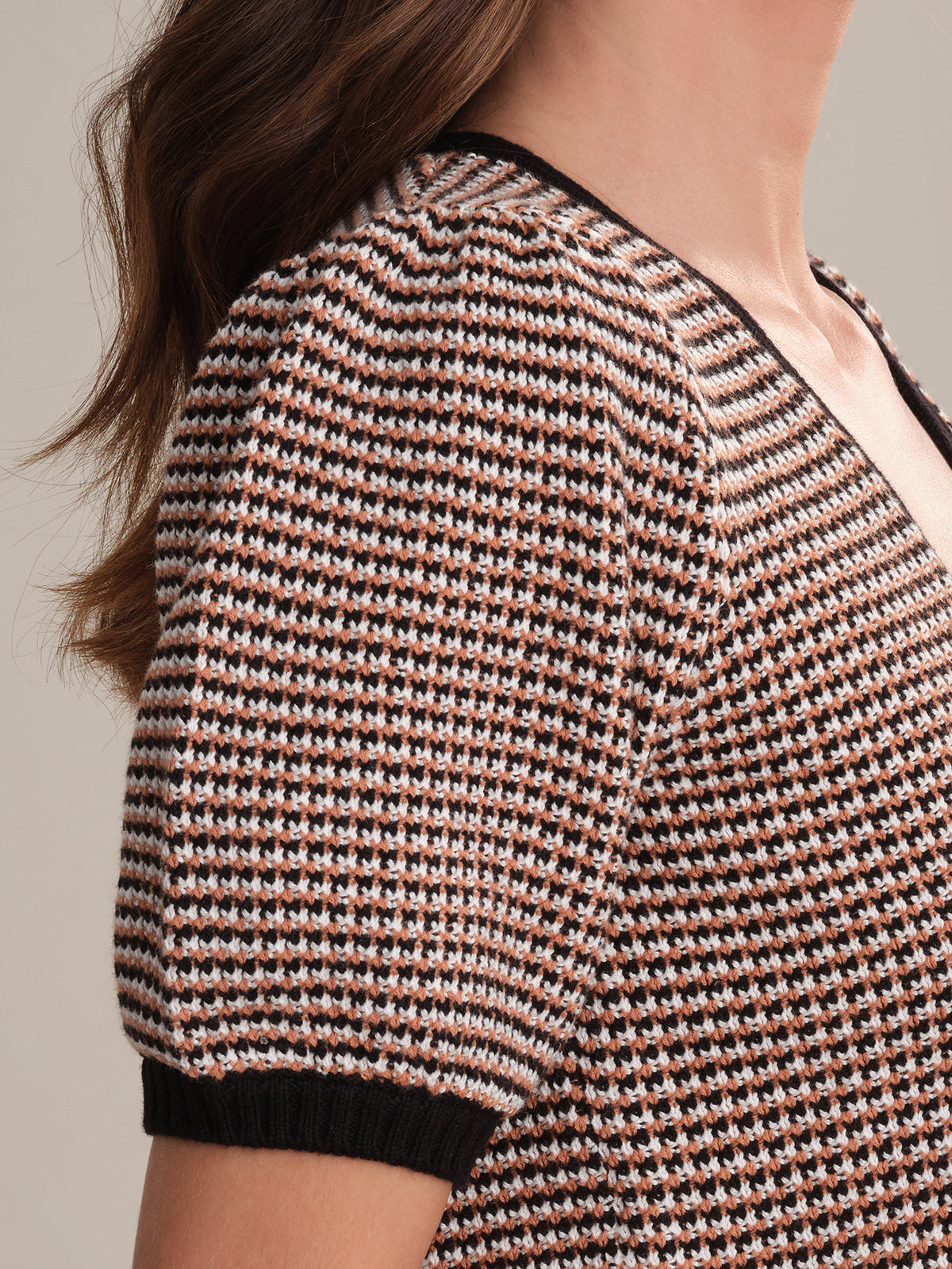 Introducing Elaine: the feminine cardigan with a twist. Its V-neck, short puff sleeves, and rib trim add style, while the bow ties on the front give it a touch of femininity. Stay stylish and cozy with this must-have addition to your wardrobe.