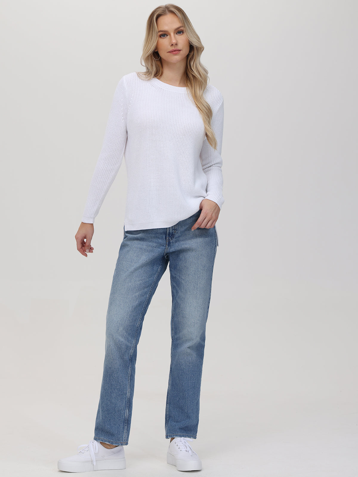 A woman with long, wavy blonde hair wears a relaxed-fit 100% cotton white knit sweater by 525 America and blue jeans. She stands against a plain light background, facing the camera with a slight smile.