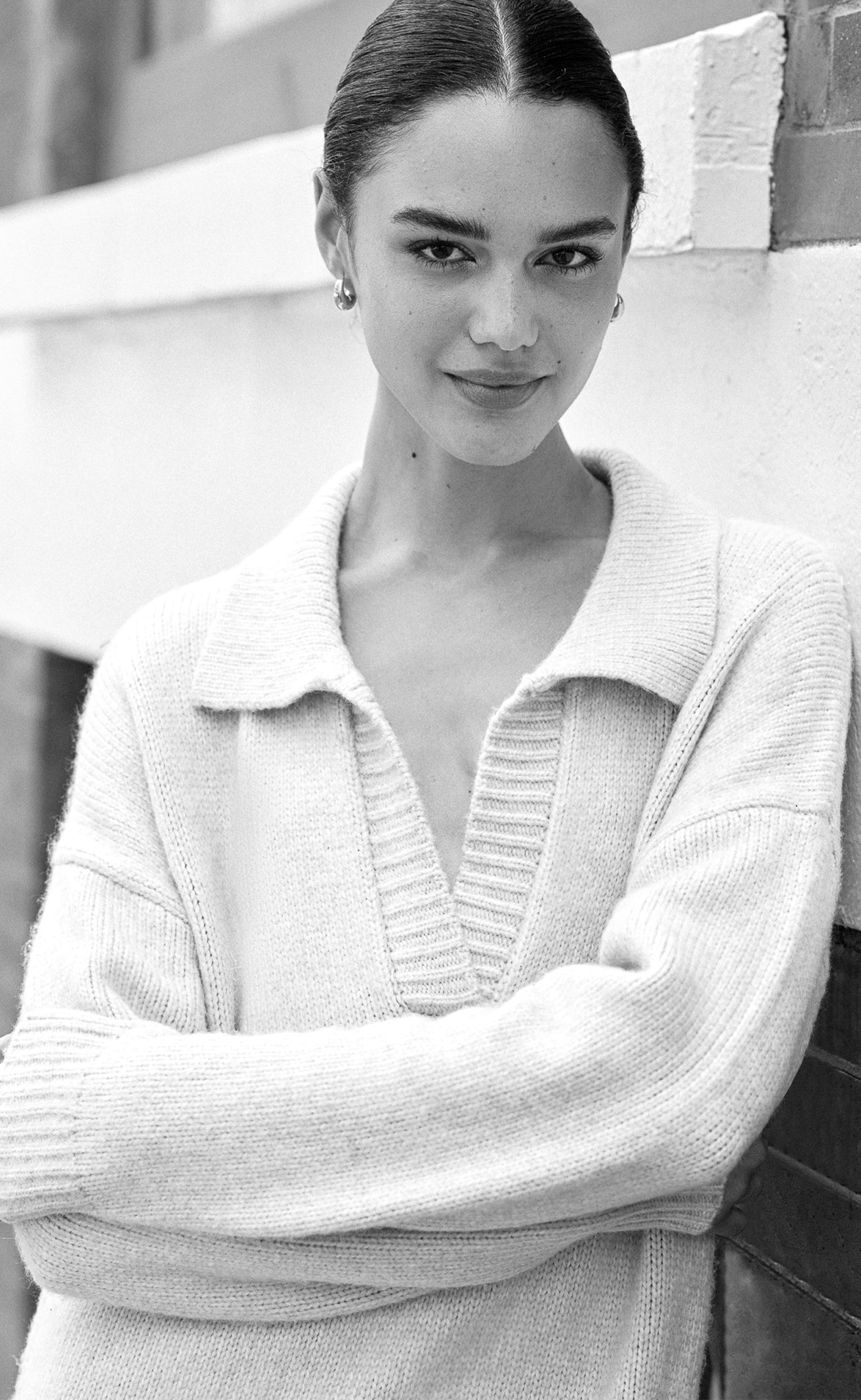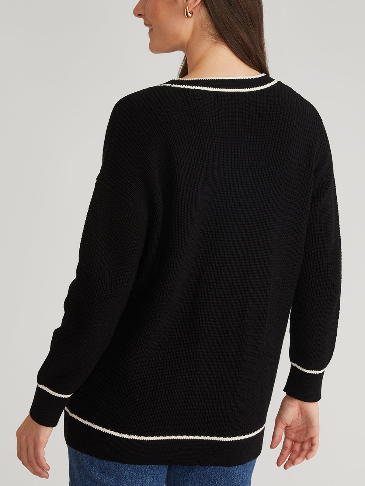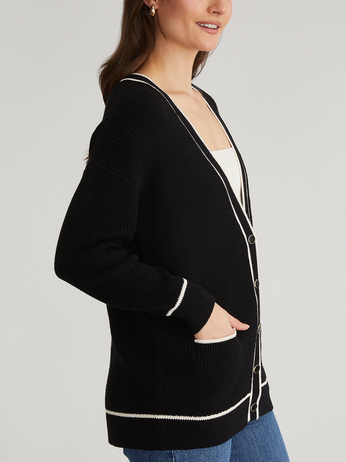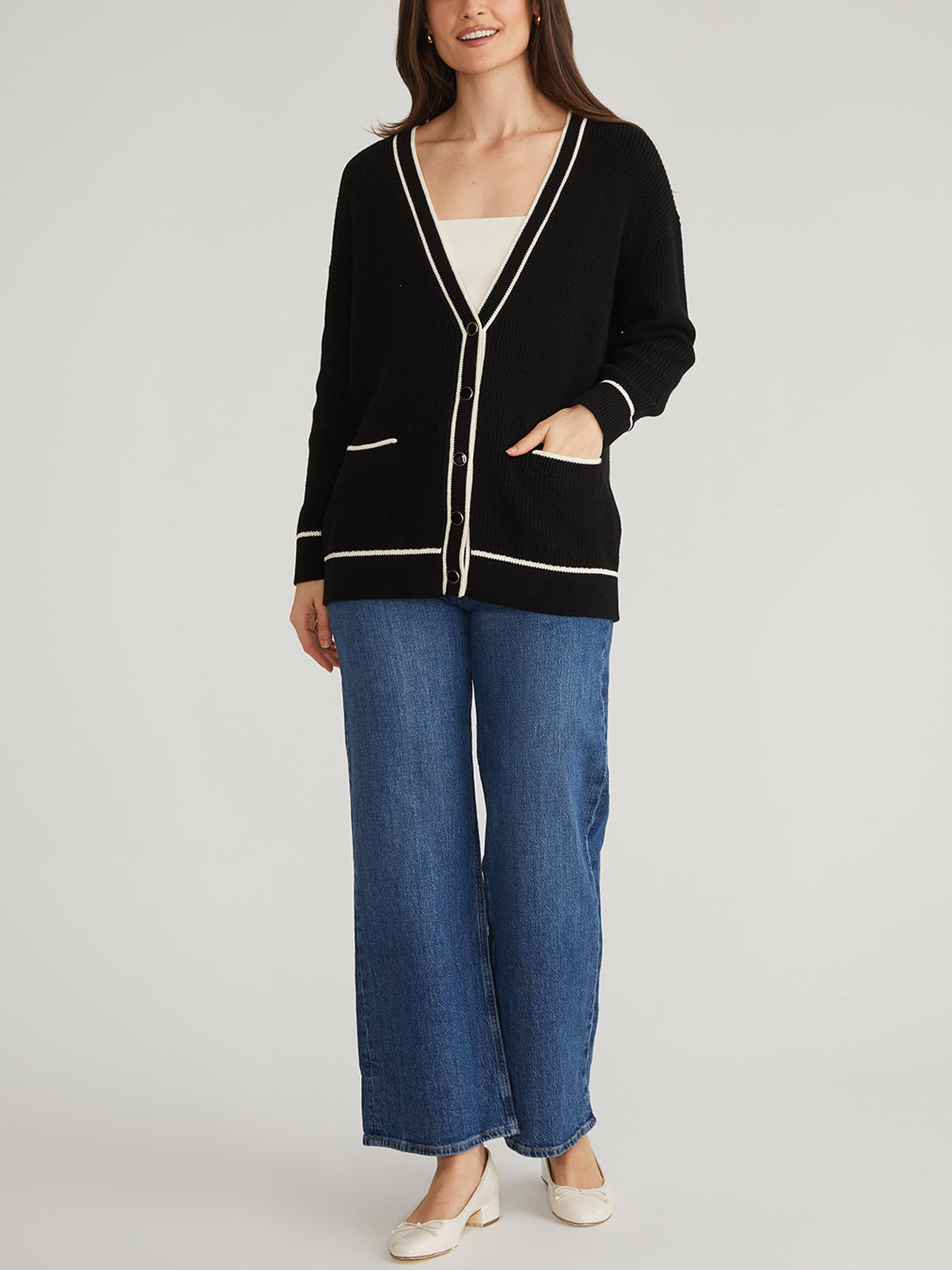 Our favorite style Emma in an oversized cardigan! Expertly crafted and designed for comfort, this oversized grandpa-style cardigan with contrast tipping and convenient front pockets provides a relaxed fit for any occasion. Upgrade your wardrobe with Emma's effortless style and functionality.