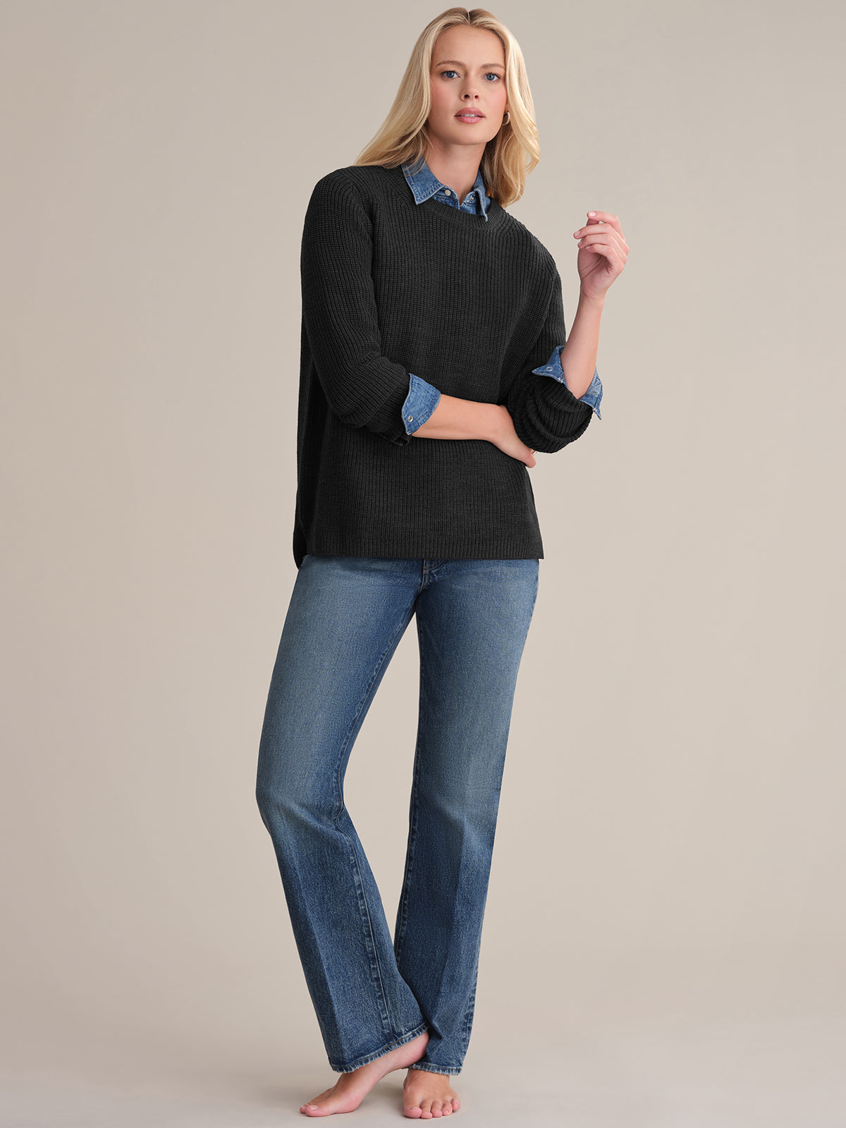 A person with long blonde hair wears the Emma: Wool Crewneck Shaker Stitch Sweater in black over a blue denim shirt and jeans. They stand against a plain background, one hand on their hip, looking slightly to the side.