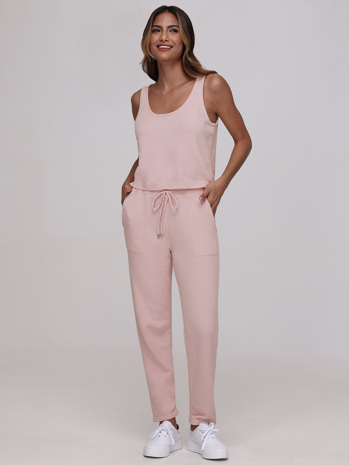 A person with long hair stands against a plain background, wearing 525 Americas light pink sleeveless top and drawstring pants. They hold the bottom of the cozy sweater tank, which features a relaxed fit ideal for any occasion, all while smiling.
