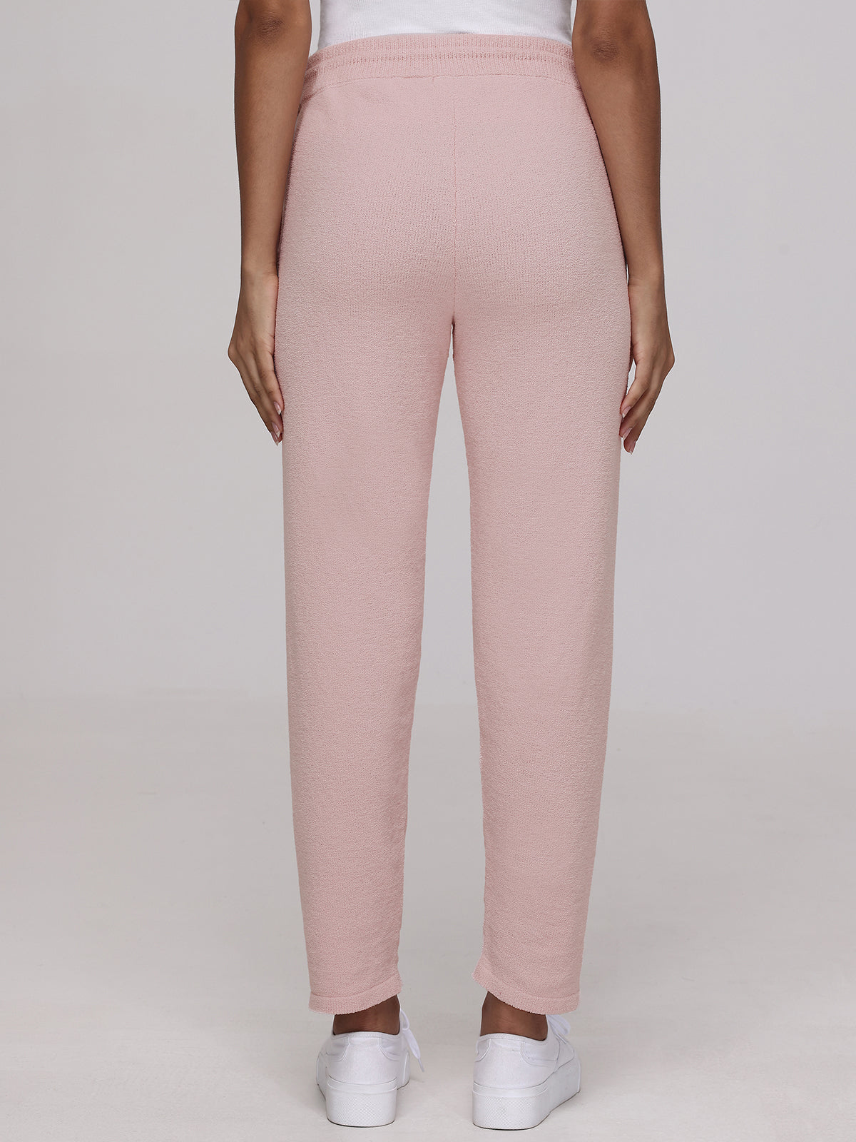 A person in 525 Americas light pink jogger pants made from plush fabric, featuring a drawstring waist and pockets, paired with white sneakers against a plain light background.