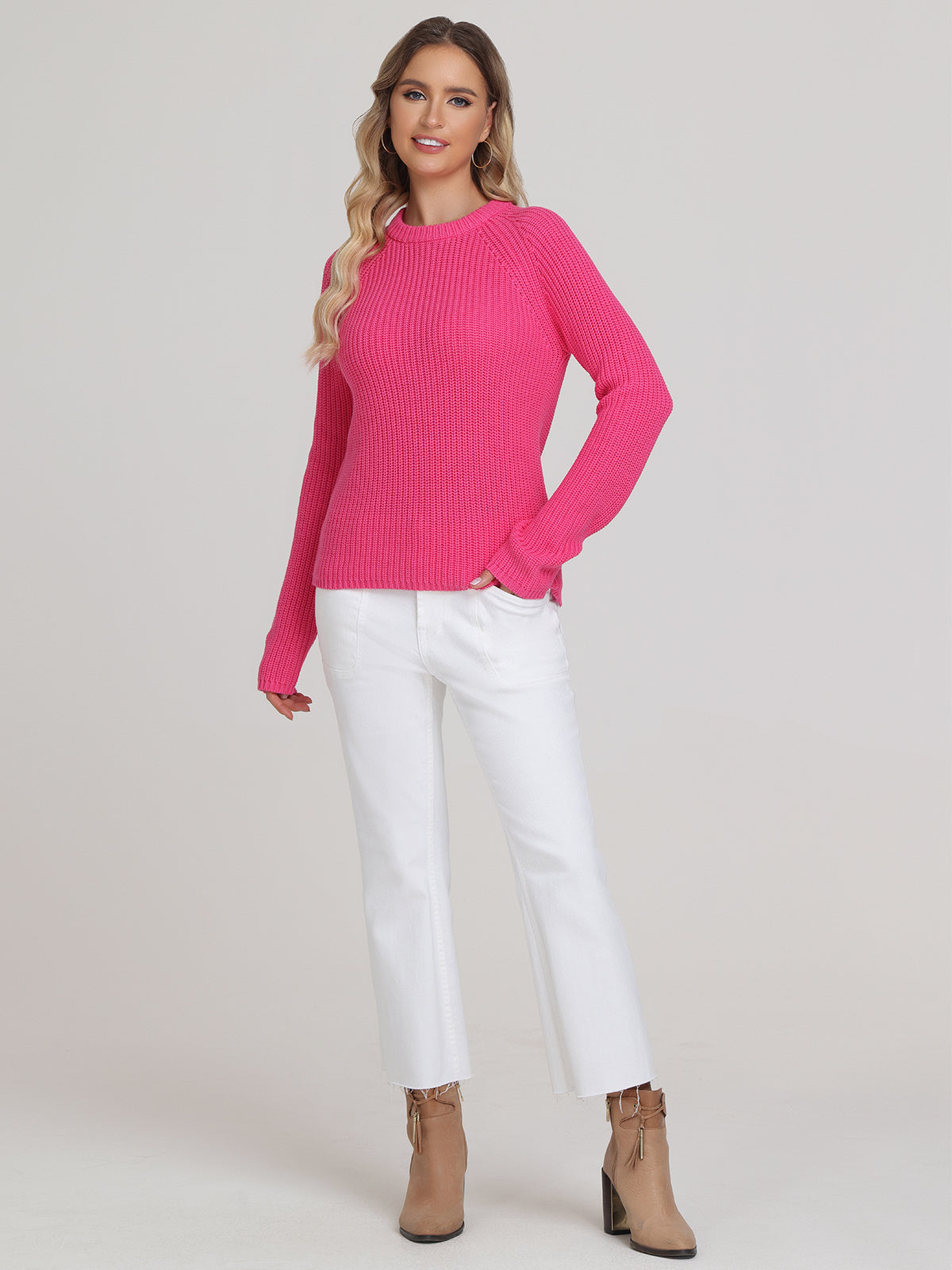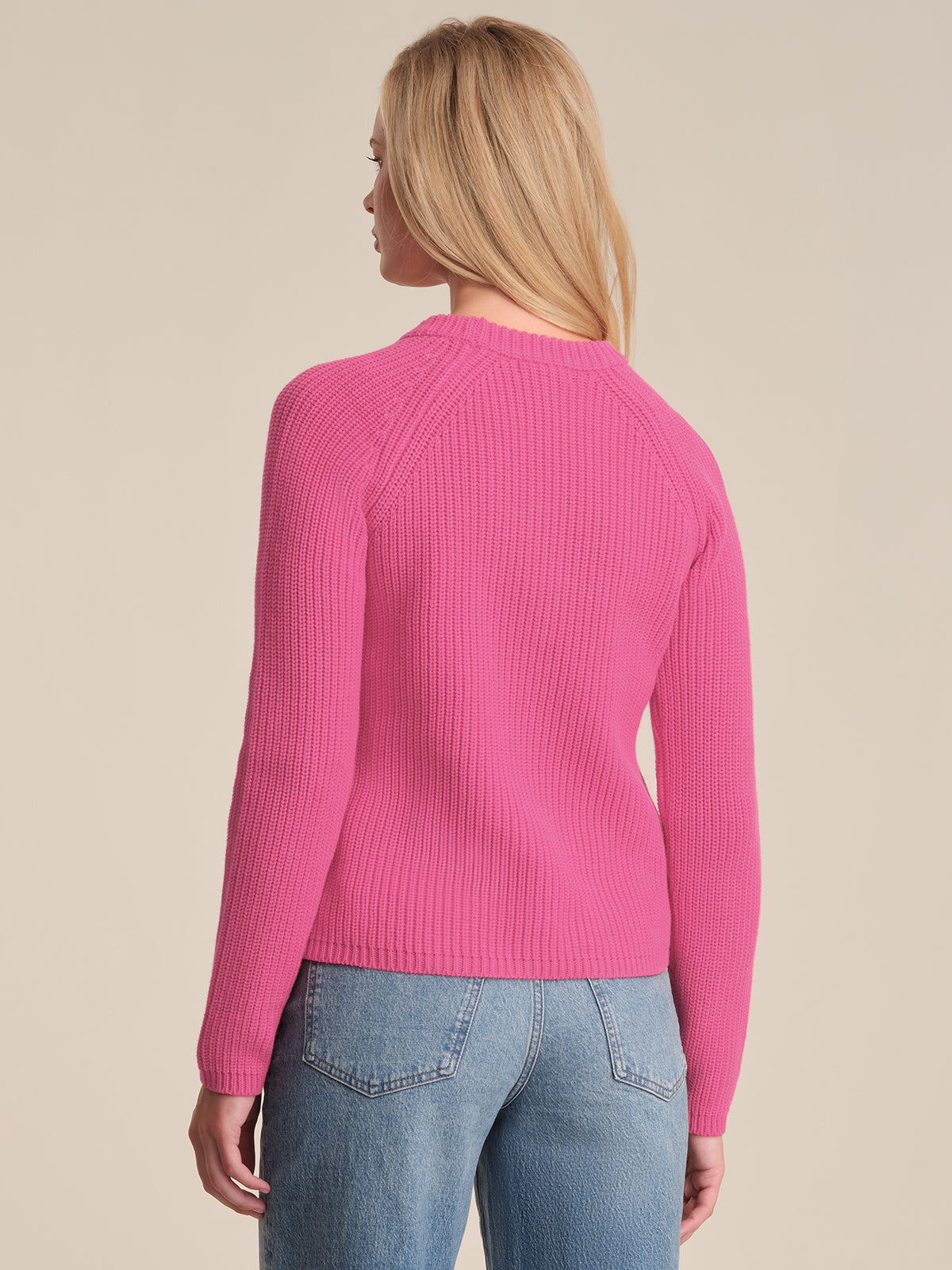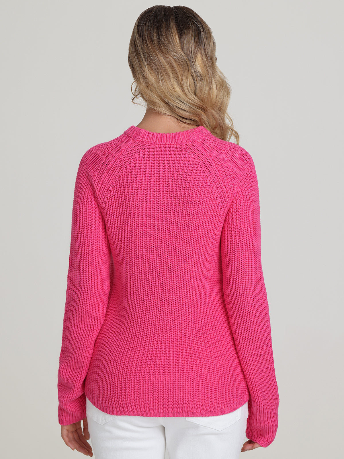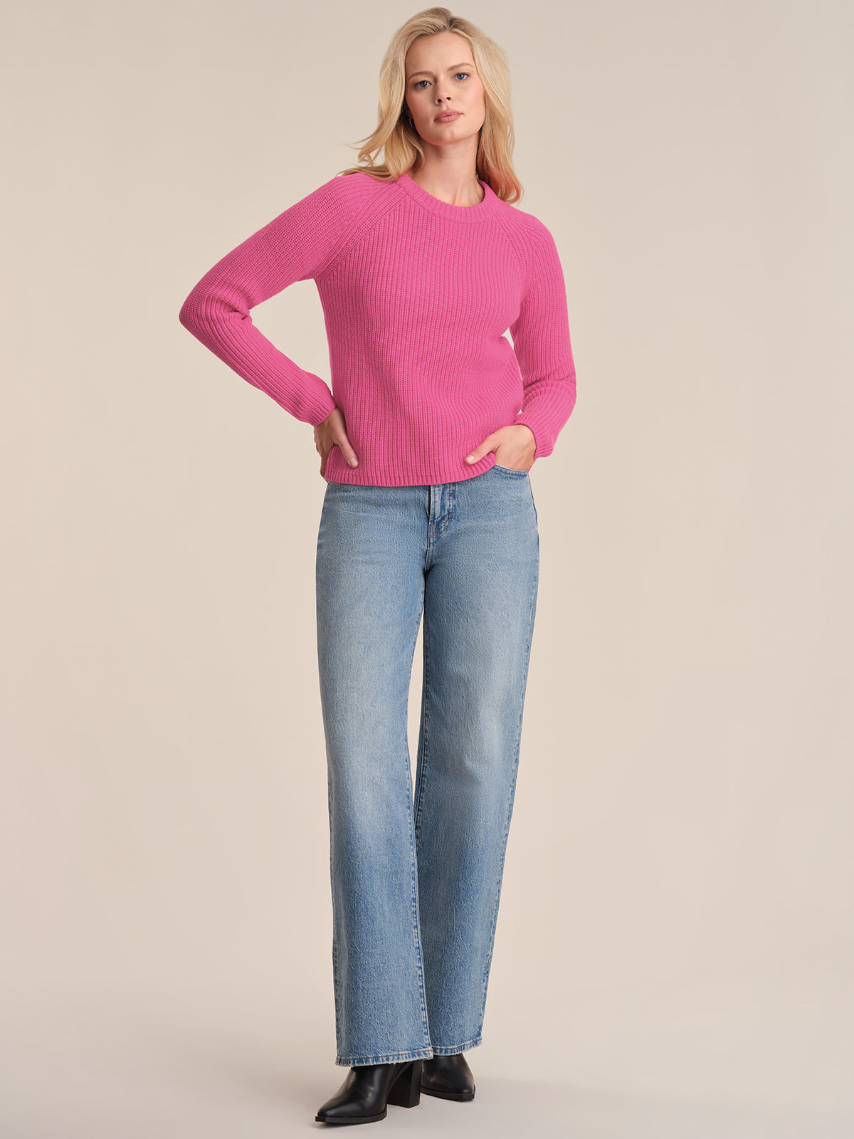 Someone wearing a 525 America bright pink cotton shaker stitch sweater with raglan sleeves and light blue jeans stands against a plain beige background, looking to the side with one hand in their pocket.