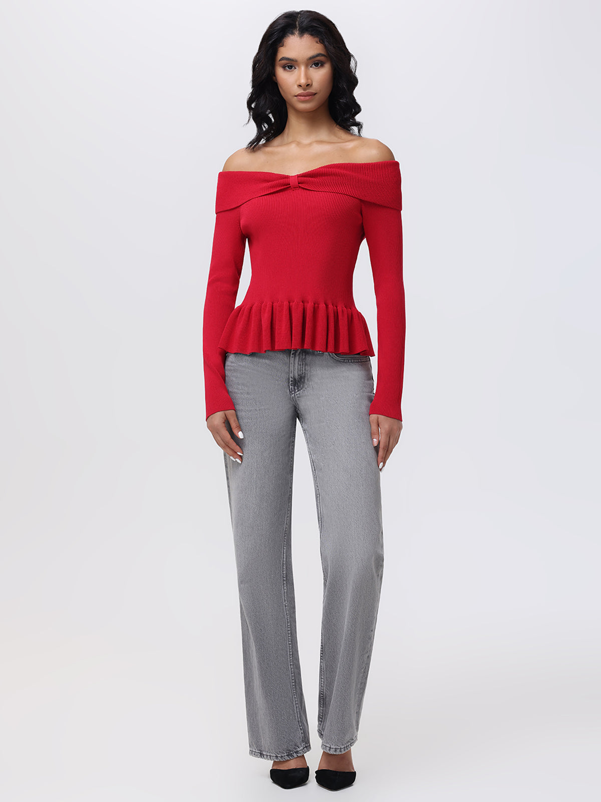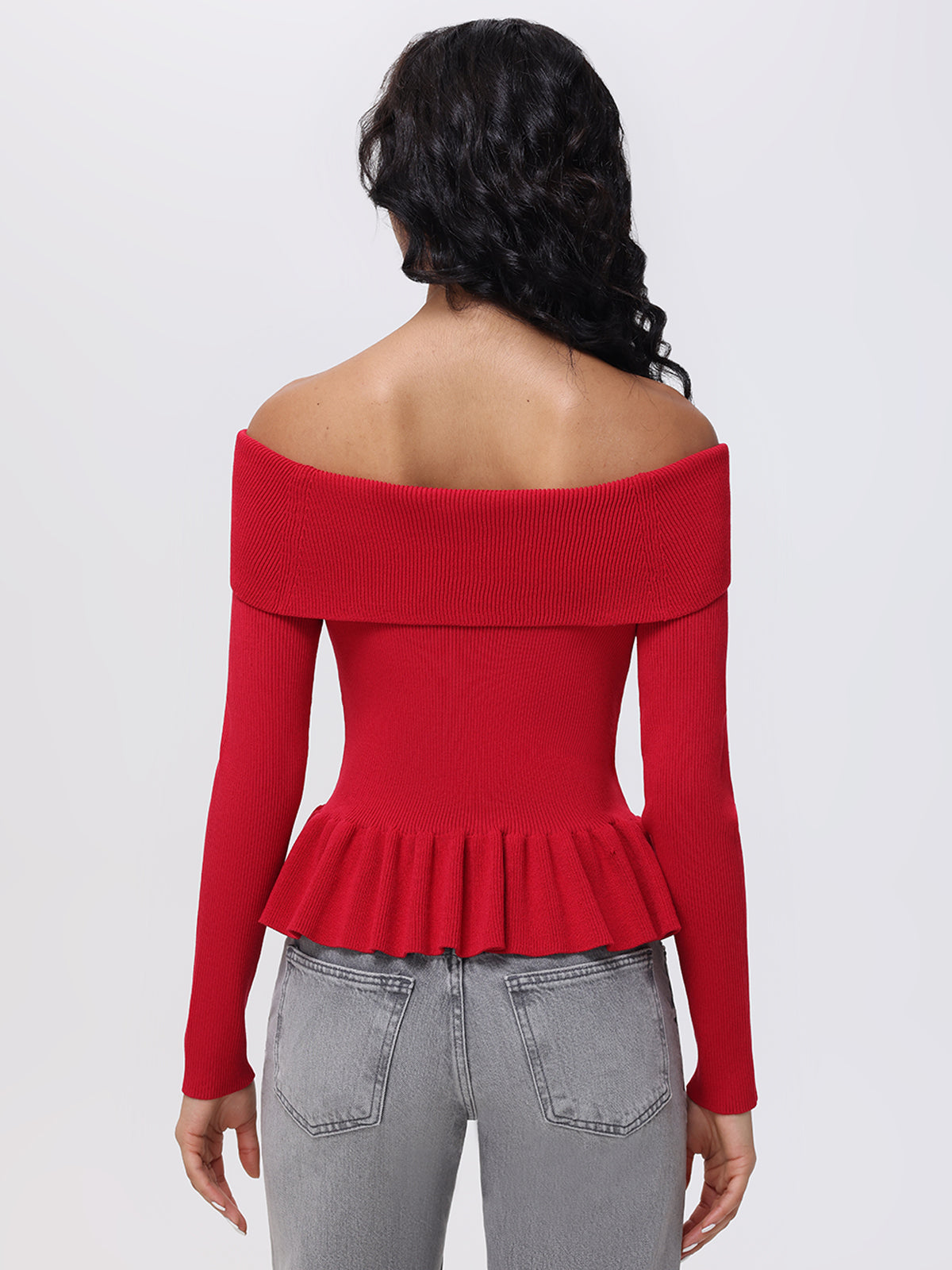 A person with long black hair wears a red 525 America Off Shoulder Peplum Pullover, featuring chic ruffles at the waist and a bow detail, paired with gray jeans. They stand against a plain light background, effortlessly embodying stylish elegance.