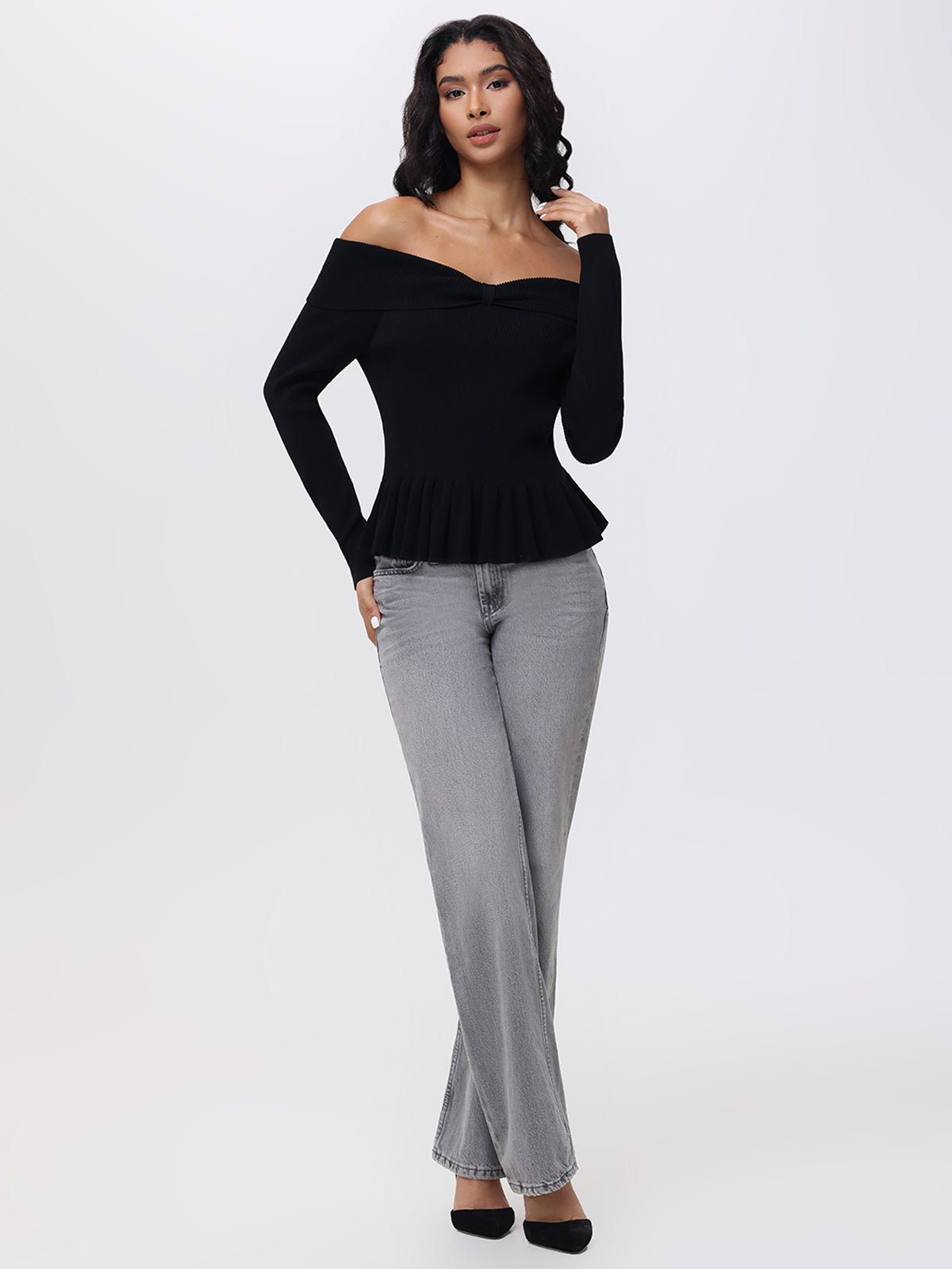 Elevate your style with the *Morgan Off Shoulder Peplum Pullover*. The knotted neckline adds a chic touch, while the off-shoulder design gives it a flirty, modern edge. The peplum hem flatters your silhouette, making it the perfect choice for both casual and dressy occasions. Step out in confidence with this versatile pullover that seamlessly blends sophistication and style.