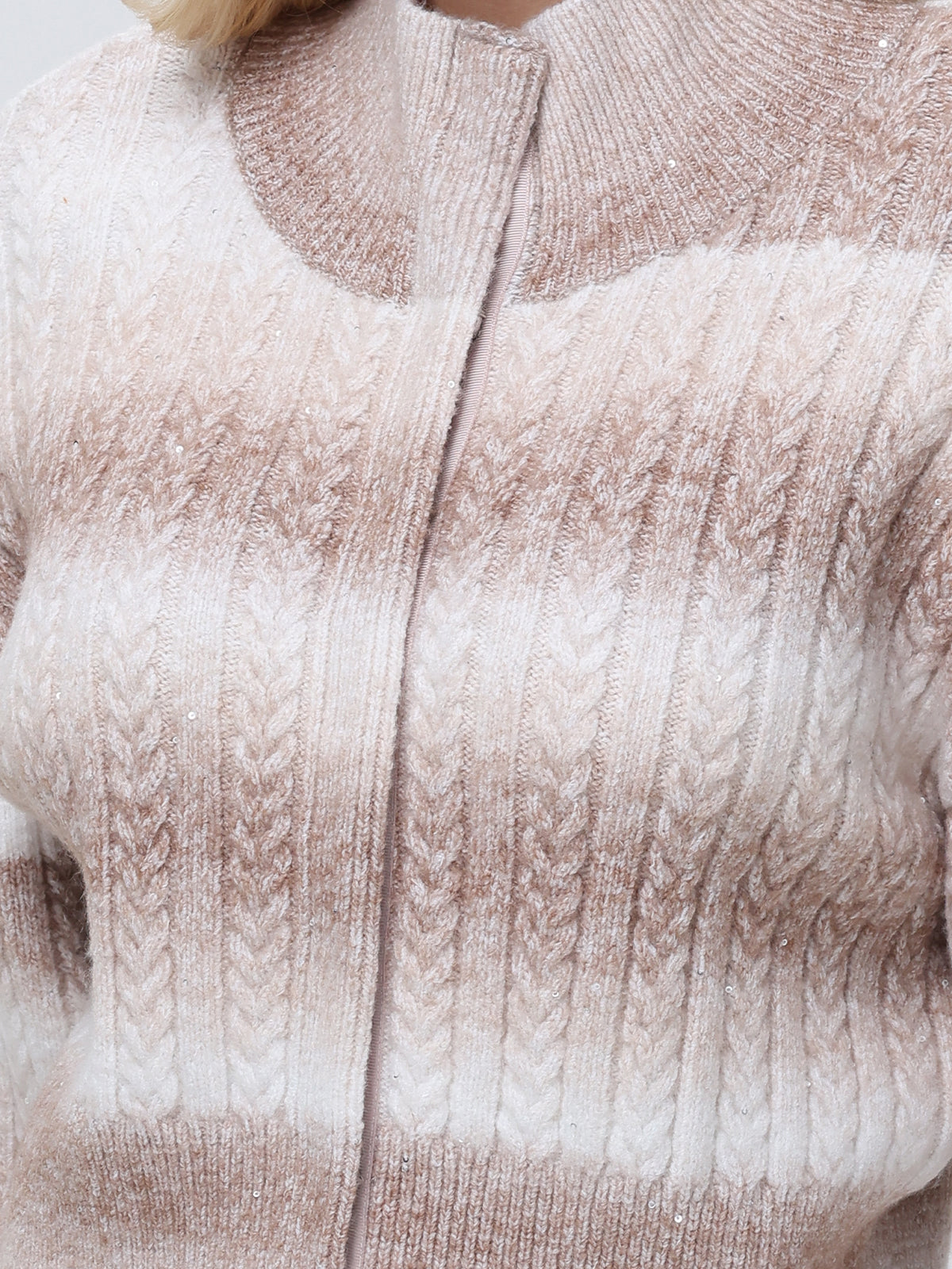 A woman with long blonde hair, wearing a stylish 525 America striped zip-up cardigan and gray jeans, stands against a plain gray background. Structured shoulder pads enhance her look as she rests her left hand on her hip, radiating confident style.